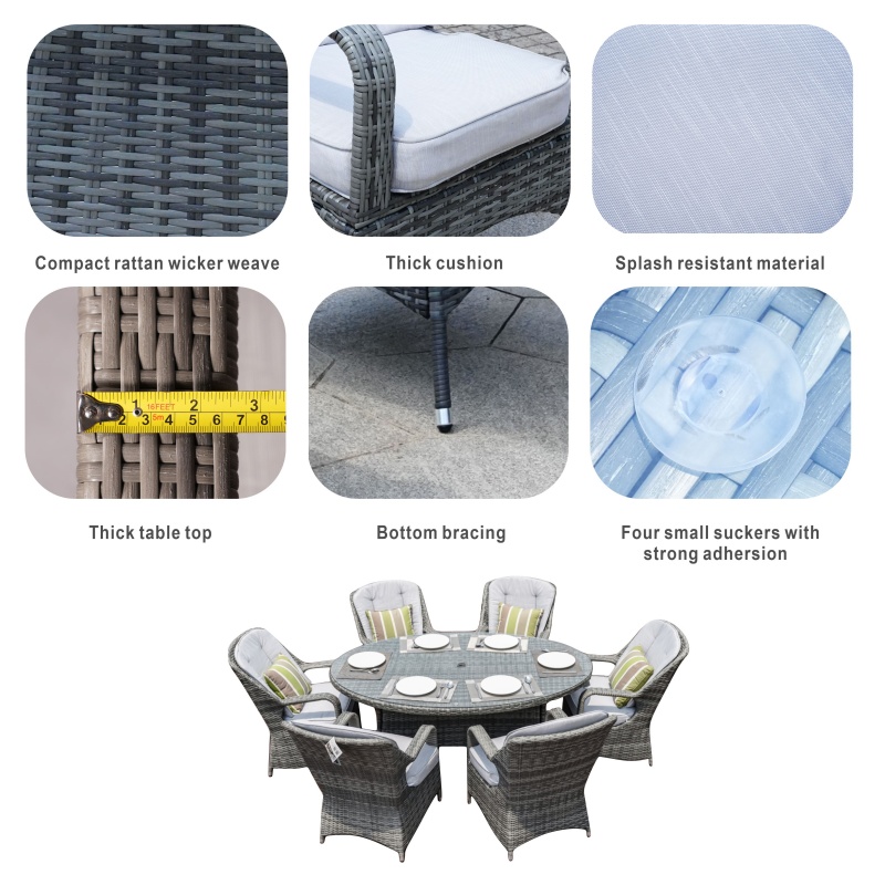 This Aluminum Rattan Oval Dining Table Set combines functionality with elegance, making it perfect for enhancing your outdoor dining experience. The durable aluminum frame and UV-resistant rattan ensure long-lasting use and easy maintenance. The tempered glass table and waterproof design provide a comfortable and stylish dining area. The easy assembly design makes storage and transportation easy. Enhance your outdoor area with this stylish and functional dining set.